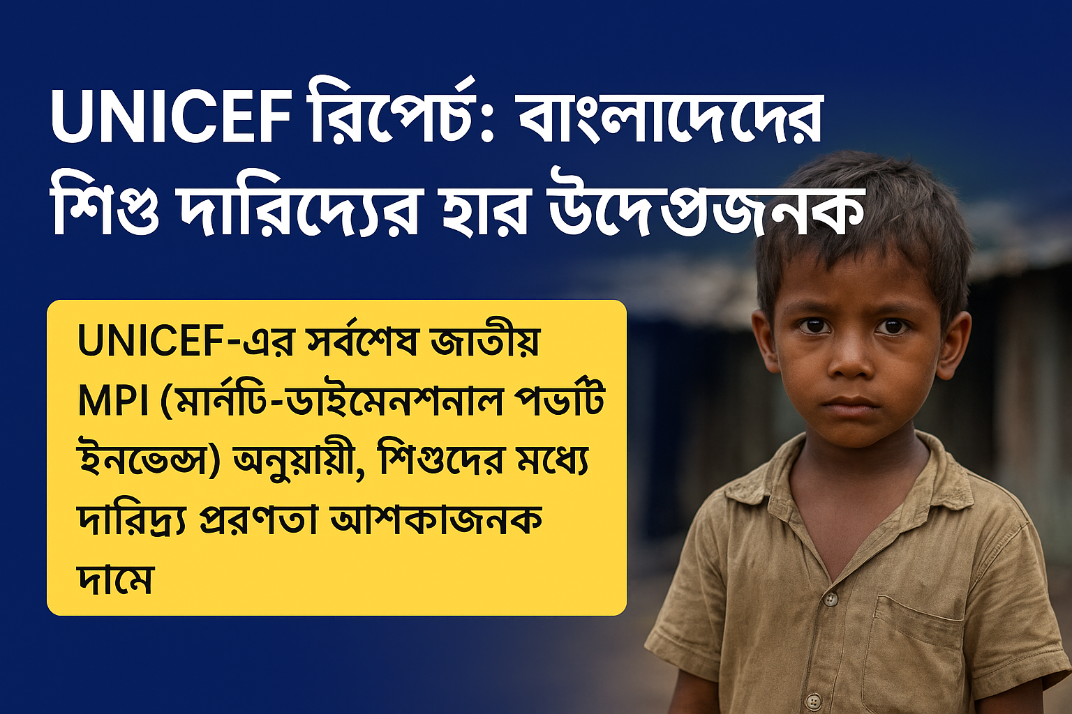 বাংলাদেশের অর্থনৈতিক উন্নয়ন গত কয়েক দশকে উল্লেখযোগ্য অগ্রগতি অর্জন করলেও, UNICEF-এর সর্বশেষ জাতীয় মাল্টি-ডাইমেনশনাল পভার্টি ইনডেক্স (MPI) রিপোর্টে উঠে এসেছে এক অপ্রিয় বাস্তবতা—দেশের শিশু সমাজের একটি বড় অংশ এখনও দারিদ্র্যের কঠিন বেড়াজালে আবদ্ধ। শিক্ষা, স্বাস্থ্য, ও জীবনযাত্রার মান এই তিনটি মূল সূচকের উপর ভিত্তি করে তৈরি এই রিপোর্টে শিশুদের জন্য সামাজিক নিরাপত্তা ও সুযোগের ঘাটতির একটি উদ্বেগজনক চিত্র ফুটে উঠেছে।